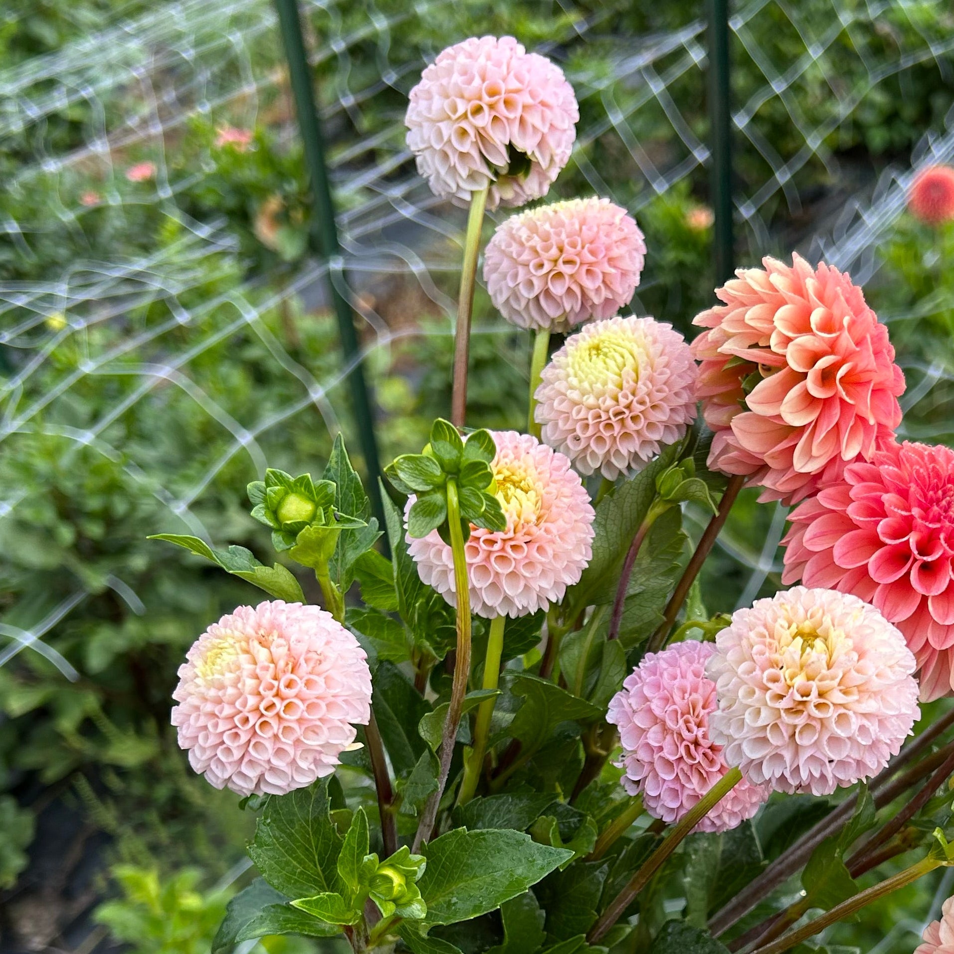 Very tall plants with tons of small pink/blush blooms. I usually don't go for pompom dahlias, but this one is too cute to miss out on.